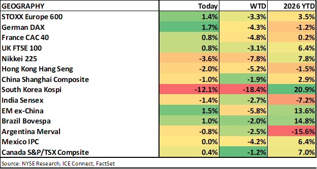 It was a rough overnight session in Asian markets which is an understatement when referring to South Korea’s Kospi index. This has become one of the biggest momentum trades in the market and been on a parabolic move higher recently, driven by strength in memory companies Samsung and SK Hynix which make up nearly half the market capitalization. Overnight multiple circuit breakers were triggered with the index ending the session down ~12%, the worst single day decline in history, and down ~20% over the last two days but it is still up about the same amount YTD. The Nikkei also fell over 3% for the second consecutive session. China NBS PMIs remained in contraction coming in slightly below expectations though the private sector ticked up to 53.8 from 53.7. Ahead of the National People’s Congress the Shanghai Composite fell 1% while the Hang Seng was down ~2%. European indices opened slightly higher and have been improving throughout session but keep in mind the indices closed down >3% yesterday, before US markets bounced.