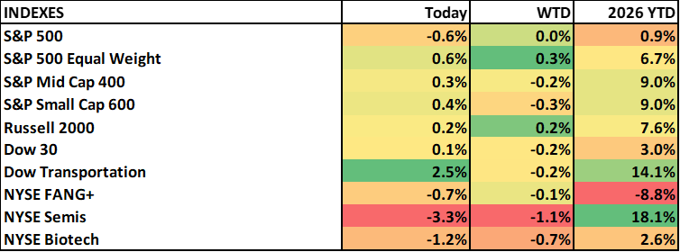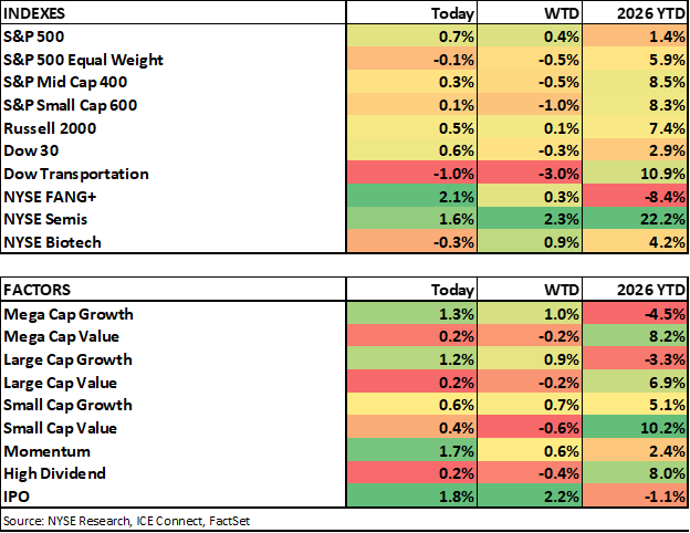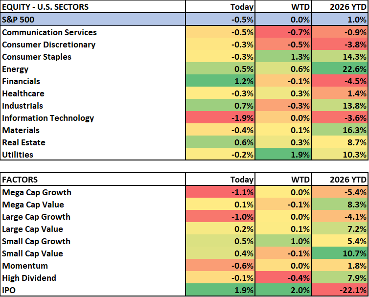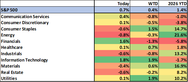 Yesterday most major US indices closed higher as some of the AI anxiety from earlier in the week faded. Mega-cap tech and software led to the upside ahead of a big evening of earnings. Financials which also got throttled on Monday bounced back while staples and commodity related sectors gave back some of the recent gains as the atoms vs. bits trade retraced. The S&P closed up 0.8% closing above its 50d for the first time since 2/11 putting the all-time high ~7k squarely in the cross hairs again.