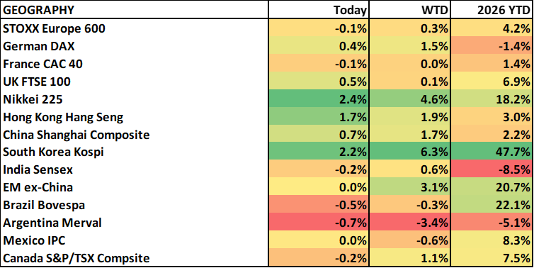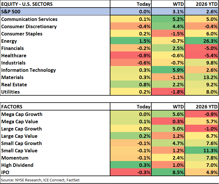 Yesterday was a record setting for the S&P 500 though there didn’t seem to be much fanfare. The index closed above 7k for the first time in history ending up 0.8%, near session highs. However, breadth was not particularly robust as the equal-weight closed unchanged, the Russell 2000 lagged and the Dow fell. It was tech that led the charge with the NYSE 100 extending its winning streak to 11 days. However, there was some bifurcation within this sector as well. The much-maligned software names extended their recent bounce (IGV +4%) while semis were weak despite strong earnings from ASML (a pattern we’ve seen quite a lot of in tech). Some higher risk thematic areas also saw continued strength, like Quantum Computing, helped by technological advancements and industry gatherings.