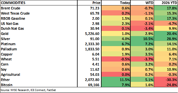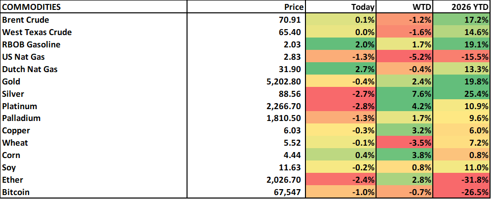 Commodities are mostly lower. Negotiations with Iran are ongoing while President Trump is reportedly speaking with President Zelinsky later today. ICE Brent fell ~2% overnight but is off the worst levels. Natural gas prices continue to bleed lower. The metals complex is pulling back with gold down ~1% and silver off ~4%. The correlation between software and crypto continued yesterday with the complex rallying sharply. Bitcoin traded back up to ~70k up >10% from this week’s low before pulling back. It is currently hovering around 68k the declining 20d ma is ~69.4k a level it has not traded above since 1/19.