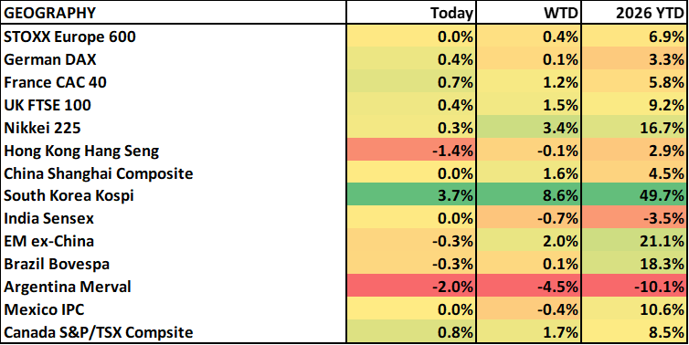 Markets in Asia were mostly higher overnight. South Korea continued to surge to the upside up nearly 4% bringing YTD gains up to nearly 50% as memory stocks continue to move higher after Nvidia earnings. As expected, the Bank of Korea left rates unchanged at 2.5%. Japan ended modestly higher. The Hang Seng bucked the trend falling >1% with broad based weakness while the Shanghai Composite ended around unchanged. European indices are modestly higher with most major indices hitting new highs.