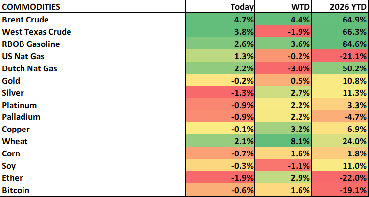 DOW 48,530 (+66), S&P 500 7,031 (+9), Russell 2000 2,711 (-3), NYSE FANG+ 15,976 (+24), ICE Brent Crude $99.47/barrel (+$4.54), Gold $4,811/oz (-$13), Bitcoin ~74.4k (-371)