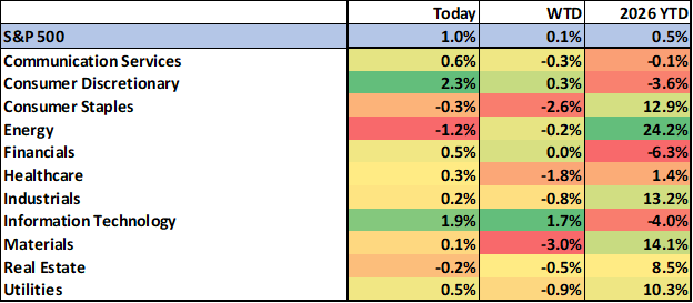 Yesterday, overnight as commodities continued to move higher, sparking “war-flation” concerns tied to the Strait of Hormuz closure equity future were under pressure at the jump. The S&P 500 extended to the downside after the open trading down ~2.5% at the lows. The index retested the December low after breaking the 100d ma, before bouncing back to opening levels as Treasury yields moved about 10bps off the overnight highs. Reports that the administration was considering providing military support to tankers moving through the Strait of Hormuz and potentially backstopping shipping insurance provided another boost. The index couldn’t quite hold a move back above the 100d and finished down ~1% with all sectors lower. Financials and Comm Services outperformed while Materials and Industrials lagged.