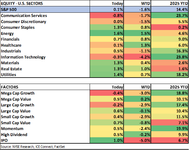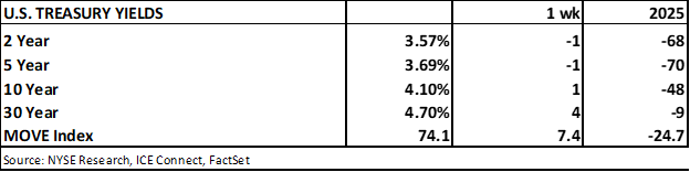 Even before the turn, there were areas of strength, especially in the less growthy and / or historically safer plays that have had more middling performance YTD. Energy was the best performing sector, with natural gas plays leading the way. Defensively-oriented Healthcare and Consumer Staples were also higher. Managed care and healthcare services were solid this week. Staples’ outperformance versus Discretionary should be called out, given the growing concern around a K-shaped economy and unyielding pressure on lower-income cohorts. Utilities and Real Estate were flat to slightly lower before ending strongly on Friday. Insurance names stood out for Financials, providing the updraft on some solid earnings and reversion from earlier weakness.