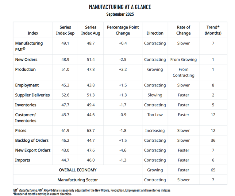 The ISM survey showed the manufacturing sector remained in contraction for the seventh straight month, but the numbers were up a touch from last month. The underlying data was mixed. New orders fell back into contraction after a 1-month reprieve while new export orders accelerated to the downside. Employment showed some modest improvement while prices moderated. The commentary in the respondents section is pretty negative with the prevailing themes uncertainty and tariffs weighing on activity.