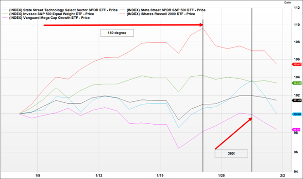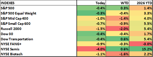 Going through some of the reports, Meta was a big winner, with shares up 10% after a big print and importantly going into detail on how AI is driving revenue growth. That addressed, for them anyway, one of the two major concerns around AI- ROIC. The other, the financial circularity of the ecosystem, remains outstanding. The company will also increase capex by about 70% next year to around $125 Billion, or about 40 times the GDP of Greenland. That was another endorsement of the durability of demand for the AI enablers. IBM was up 5% on AI-related strength too. On the other hand, Microsoft was hit hard, down 10% despite what on the surface was strong revenue and EPS numbers. The weakness was chalked up to several items: above-the-clouds expectations, concern that a huge chunk of future revenue is still tied to OpenAI, and potential caps on Azure (cloud) growth due supply constraints. Outside of tech, Caterpillar and Mastercard traded well after their earnings and Royal Caribbean ripped higher on theirs, helping to drive Travel and Leisure names higher.