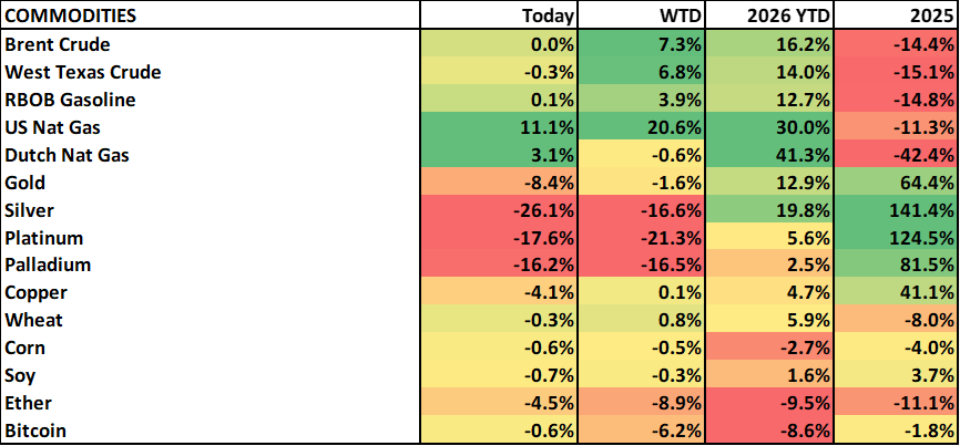 With the Fed and earnings out of the way, the other big market story was the insane moves across commodities, in particular metals, which we discuss below. With the big drawdown on Friday, next week’s initial action will be must-watch. It will be interesting to see if the recent flows into that area get redeployed into other assets, like crypto.
