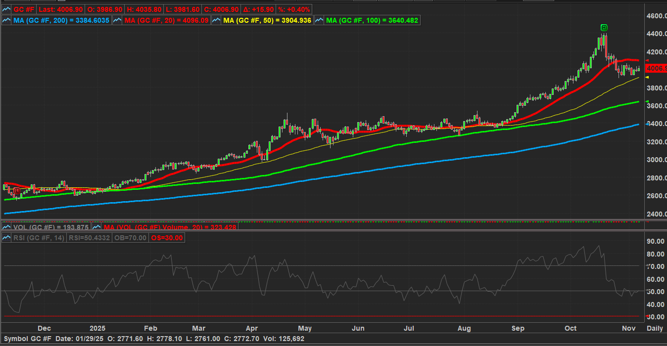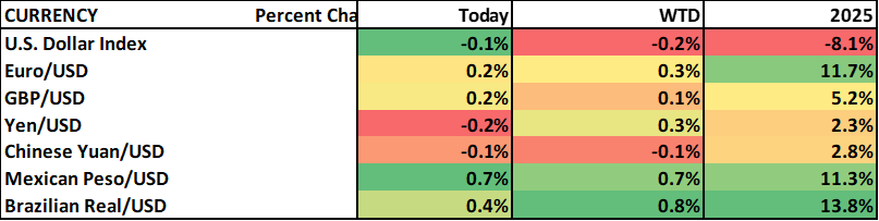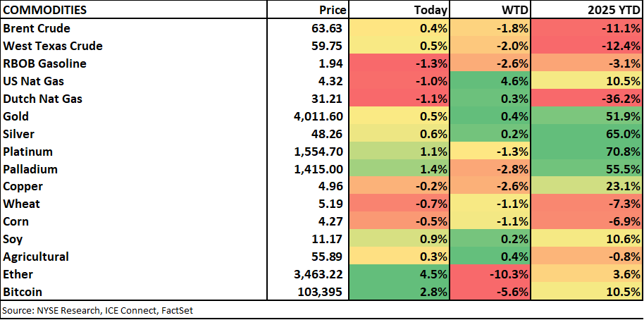 DOW 46,987 (+75), S&P 500 6,729 (+8), Russell 2000 2,433 (+14), NYSE FANG+ 16,414 (-20), ICE Brent Crude $63.73/barrel (+$0.35), Gold $4,009/oz (+$18), Bitcoin ~103.4k (+2348)
