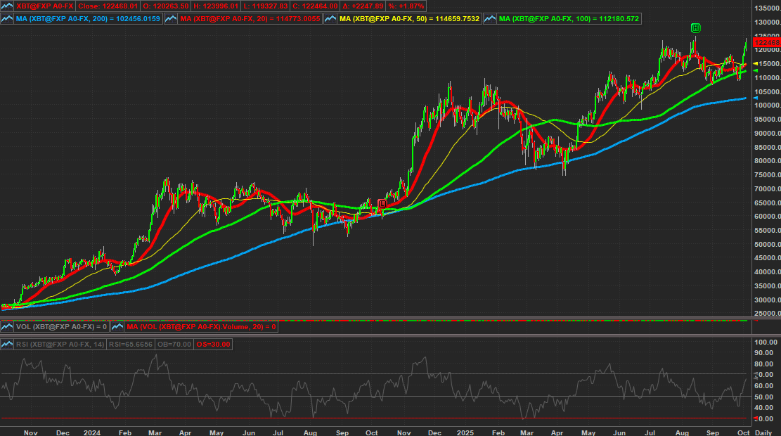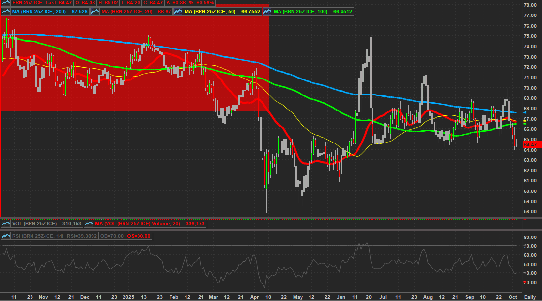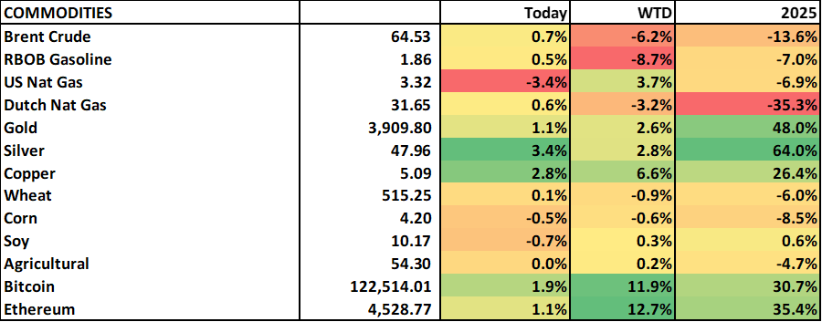 DOW 46,758 (+239), S&P 500 6,716 (+0), Russell 2000 2,476 (+18), NYSE FANG+ 16,118 (-90), ICE Brent Crude $64.49/barrel (+$0.38), Gold $3,910/oz (+$41), Bitcoin ~122.5k (+2300)