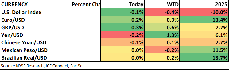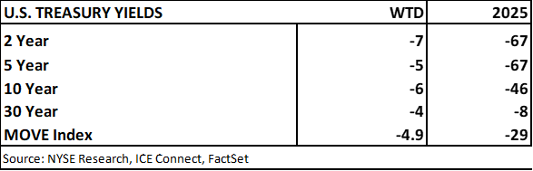 Treasury yields were down ~5bps across the curve, reversing much of last week's move higher. The ICE BofA MOVE index continues to drift lower breaking below 70 for the first time since May of last year.