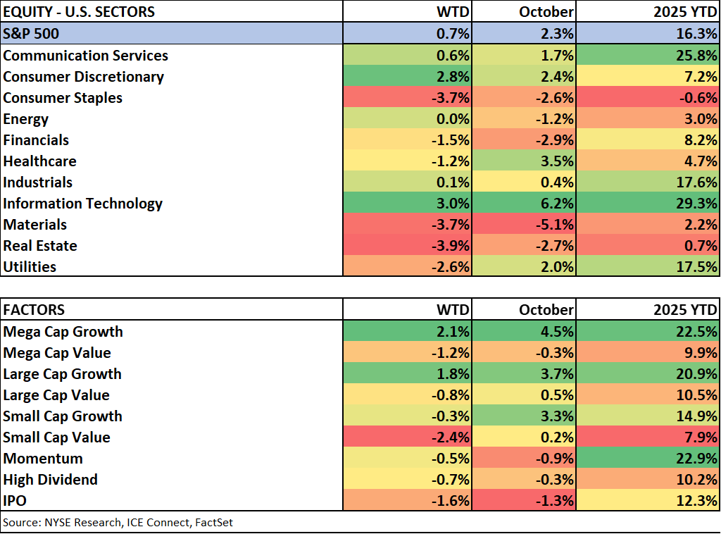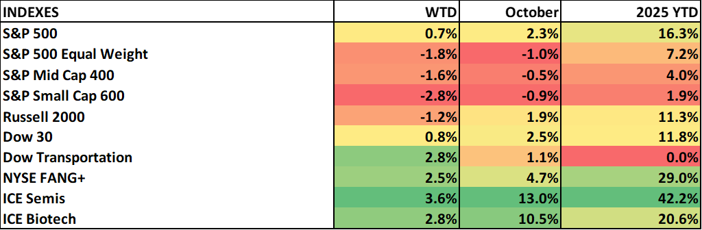 That dynamic was partially behind some of the rotation seen in the market this week as the interest rate sensitive and cyclical areas of the market turned lower this week with the equal weight version of the S&P 500 and small/mid-cap indices all falling >2%, giving up October gains. The S&P 500 was able to eke out a gain as technology and AI-related stocks masked much of the weakness beneath the surface. This week earnings across the sector were pretty strong while highlighting that demand is expected to remain strong throughout at least 2026. The OpenAI and Nvidia Halos expanded faster than news of a house giving out full sized candy bars. Nvidia briefly became the first company to crack the $5T market capitalization threshold after Jensen Huang gave the keynote address at the GTC conference announcing partnerships and investments to drive advancement in 6g networking, autonomous vehicles, robotics and supercomputers. This along with an announcement by Qualcomm that it was building its own AI chip and AMD partnering with the government to build two supercomputers helped the ICE Semiconductor index end the week up >3% and >10% for the month.