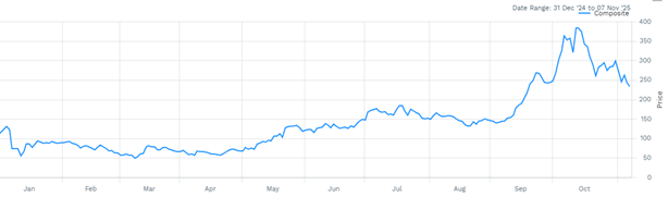 This week, we said goodbye to Daylight Savings. As of today there are 36 trading days left in 2025, by my calculations, and Black Friday is 15 trading days away. We also said goodbye, at least temporarily, to tech strength. AI deals and partnerships continue to spill out, but their expanding mass is starting to create gravitational forces that are pulling in more scrutiny than price upside. Questions around revenue circularity linger. More attention is being paid to the growing number of debt-financings to fund AI expansion, and in particular the off-balance sheet nature of them. Deutsche Bank was reported to be looking into ways to hedge their AI lending exposure, including shorting AI stocks and synthetic risk transfers. While that may just be standard operational prudence, the timing and optics are not ideal. A lot of ink was spilled on the news that Michael Burry’s Scion Capital was short not housing again, but Nvidia and Palantir.