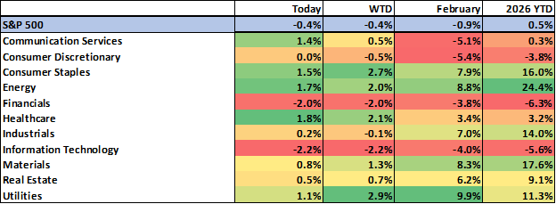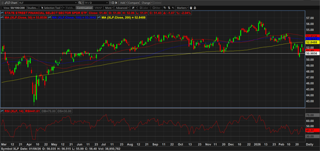 The AI wave fell earlier upon data service businesses and Insurance brokers/service providers which has been the big drag on the sector. Crypto-leveraged names- exchanged, brokers, service providers- were also under pressure. A new round of Private Credit concerns (the latest from renewed chatter around the MFS bankruptcy) as well as concern of AI-triggered layoffs swelling (e.g. Block’s announcement this week) continue to weigh on the sector. Meanwhile, long-term yields are falling, potentially impacting NIM.