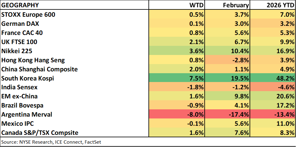 - South Korea - This has been the best performing market YTD with tech outperformance with heavy exposure to memory. The Kospi was up 7.5% this week nearly 20% in February and almost 50% YTD.
