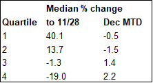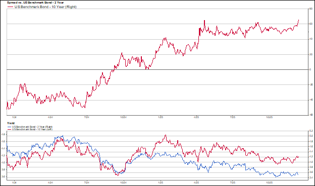 That brings us to a more broader look at rates. Global yields have backed up during December. US, Germany and France have seen 10 and 30y yields rise 15-20bp. The short end has also backed up ex-US by around 10bp across several major geographies. However in the US, the 2y has only moved about 3bp higher MTD, and this week saw the 2y decline 4bp on the heels of the Fed cut, pushing the curve steeper by ~10 more bp, reaching YTD highs.