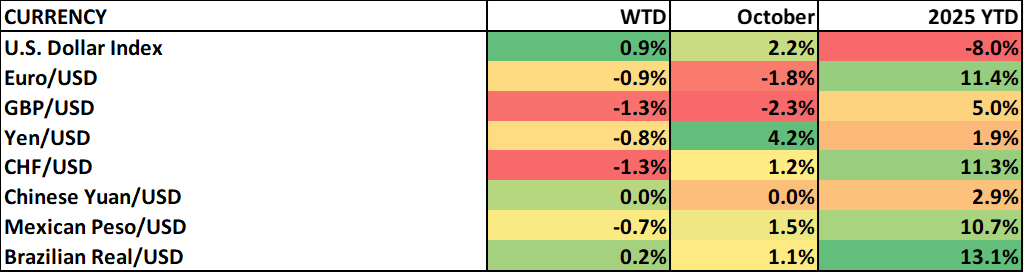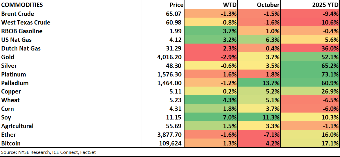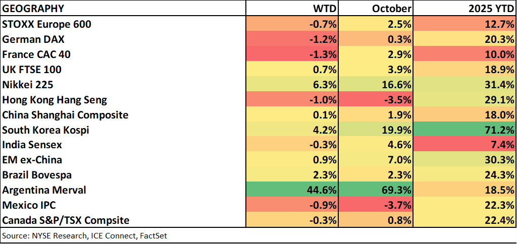 The trade headwinds have subsided as this seems to be a case of “escalate to de-escalate” with the US and China essentially agreeing to a one-year truce this week. President Trump called yesterday’s meeting with Xi Jinping amazing, a 12 on a scale of 1 - 10. China agreed to resume rare earth exports and agriculture purchases and the US cut the fentanyl related tariffs in half and delayed a rule that would expand restrictions on blacklisted Chinese firms. While in Asia this week President Trump also finalized a trade deal with South Korea and announced partnerships with Japan related to rare earth minerals and nuclear technology. Rumor has it while watching the World Series with new PM Takaichi he pushed for an increase in US hotdog exports to offset the “awesome baseball players” trade imbalance Japan benefits from. However, just as trade concerns seem to be moving to the backburner, the Supreme Court hearings about the legality of tariffs is set to begin next week.
