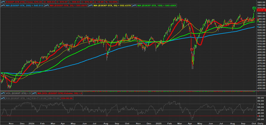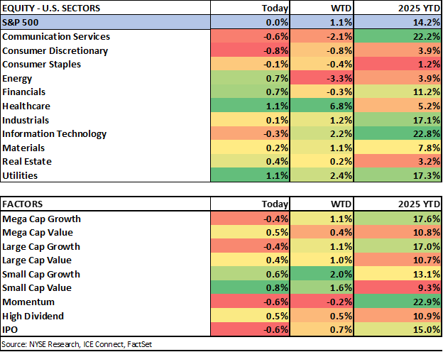 Healthcare is easily the best performing sector this week. The XLV rose 7%. That strength was triggered by significant news flow from Pfizer’s announcements with the White House around drug pricing (especially the Most Favored Nation framework) as well as US R&D and manufacturing investments. The NYSE Pharma Index (DRG) jumped 10%. LLY, AZN, PFE, MRK, SNY, BIIB all rose at least 10%. Other areas like CROs and Tools also jumped. The XBI biotech ETF is attacking the $103 level that’s been heavy area of resistance since early last year. The sector’s significant underperformance this year and last year had made the idea of a catch-up trade a possibility but it never materialized for a host of reasons. If this gets the sector out from under the administration’s microscope there could be more room to run. Utilities outperformed, benefiting from lower rates, M&A (GIP for AES) and a constant flow of datacenter investment news. Tech was also a leader, with semis strong- MU was a standout, up 20%. Memory chips supplanted GPUs in the headlines following OpenAI’s agreements with Samsung and SK Hynix. Speaking of OpenAI they completed an employee share sale that values the company at $500 billion. FICO ripped higher following its deal to allow mortgage lenders to buy FICO scores for mortgage seekers direct from the company, rather than going through the credit bureaus. Palantir got hit Friday on news an internal US Army memo noted weakness in the company’s communications and networking technology. Palantir responded and said those issues have been addressed.