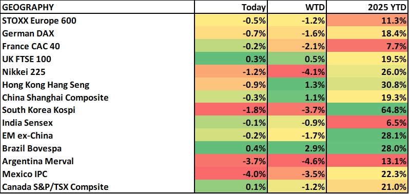 Yields and politics are also headwinds. Powell’s dovish FOMC press conference last week triggered a back-up in rates. After the Fed blackout ended, multiple Fed officials have voiced their hesitation with lowering rates further at the next FOMC meeting, providing another push higher. Should the Supreme Court overturn the Trump tariffs, yields could move up substantially as the debt situation deteriorates, though that could then lead to rate cuts from the Fed if conditions materially deteriorate. Meanwhile the growing balance of the Treasury TGA account due to the shutdown is not helping liquidity, as is the shutdown overall. Not only is it pressuring government worker income but it’s hindering economic activity more and more, such as increasing flight delays. Speaking of government, the solid election results for Democrats on Tuesday are likely to reverberate as pundits begin to size up mid-term elections next year.