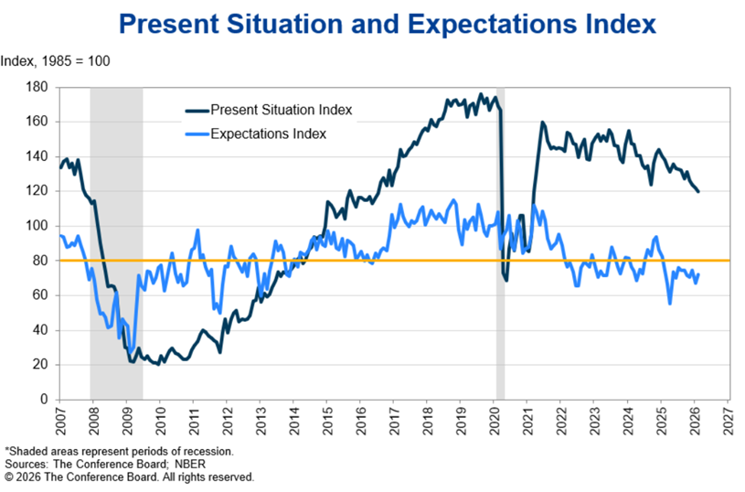 After a big drop in January, which was partially revised away, Consumer Confidence bounced back to 91.5 driven by an increase in the expectations index while the present situation continued to move lower (see below). There was an improvement in expectations around labor market conditions and income, but I would highlight that this was before any Citrini induced nightmares. Inflation expectations were little changed but remained elevated while this is still cited as impacting family financial situations which worsened after a surprise increase in January.