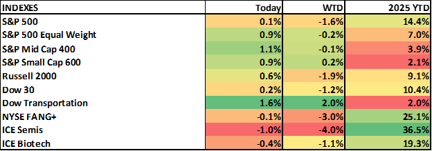 At one point on Friday the S&P was down around ~3% this week, while the equal -weight was doing better, only down about 1%. Tech and the mega caps were a significant source of weakness. The ICE semiconductor Index, FANG+ Index and Mega Cap Growth ETFs were down over 4-6%. As we mentioned above, however, buyers stepped in to defend key levels. As we rounded noon, the climb higher began. Small and mid-caps outperformed, with a caveat for small caps. We’ve noted several times the discrepancy between the makeup of the S&P 600 and Russell 2000 small cap indexes, with profitless companies excluded from the 600. That difference showed up again this week with the 600 outperforming.