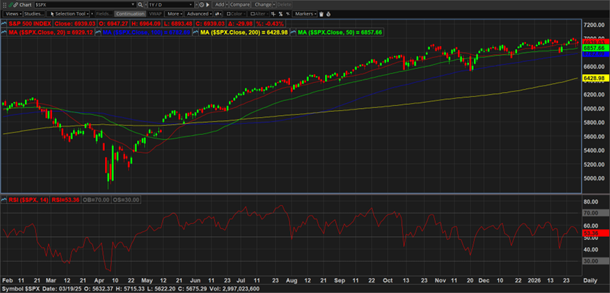So where does that leave us? The S&P 500 actually ended modestly higher for the week. First half gains, with the index briefly scaling 7000, were largely cancelled out by a second half pullback. The index spent Thursday and Friday testing the 20 and 50 day moving averages for support and we ended Friday sitting on 20 day.