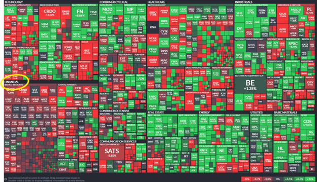 The Russell 2000 has a large Financials weight versus the S&P 500 (17% vs. 13%) and much less Tech (12% vs 33%) exposure and the admittedly crowded heat map from Finviz below shows the pressure across the financial sector in February, as well as the decent performance across most other sectors.