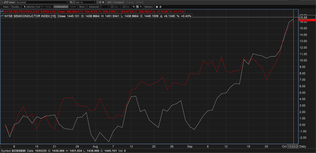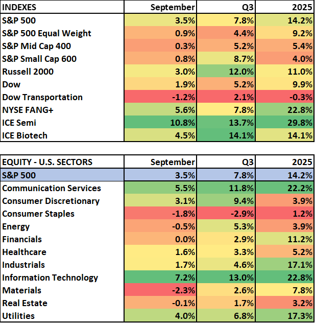 As for the third quarter, the S&P 500 was up 8%, but the small cap-focused Russell 2000 did even better, up 12%. The re-starting of the Fed’s rate cutting cycle was a big driver for that outperformance. Another small cap index, the S&P 600, which only includes companies that meet a profitability threshold, was up 9%. The delta between the R2K and the 600 highlights the movement into riskier parts of the market, as we saw sharp rallies in some of the popular thematic trades like nuclear, quantum computing and digital asset treasury companies during Q3. Another beneficiary of this was the Biotech group. The ICE Biotech index outperformed the ICE Semi index despite a late charge from the later.