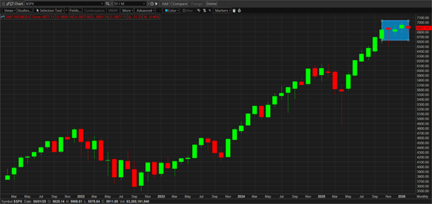 For the month of February, the S&P 500 was down 1% while staying rangebound (monthly chart below). It was only the second down month in the last 10, but both have come in the past four as the index drifts sideways near 7000.