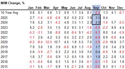 September has historically been the weakest month of the year - down an average of 2% over the past 10 years. We bucked that trend this year though, with the S&P up 3.5% (see table below). This was actually the second year in a row of solid September gains, so maybe we’re starting a new trend. The S&P 500 is up 14% YTD. It was up over 20% the past two years. October and November have been strong months for the market historically. Can we make it a 20% Trifecta this year? If the AI bid continues to lift multiple sectors higher with every deca-billion spending announcement and thematic narratives continue to work all while the Fed greases the rate cut gears? So you’re telling me there’s a chance…