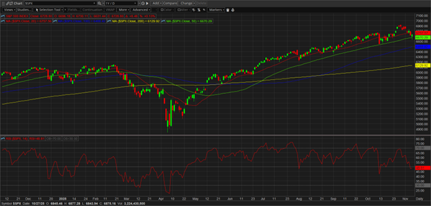Since hitting a record intraday high of 6920 just before Halloween, the S&P 500 has pulled back a bit over the past two weeks after failing to hold 6900. It then fell below its 20d moving average ~6750, putting support at the significant 50d ma in play this week, ominously around 6666. The index has not broken below it since early May.