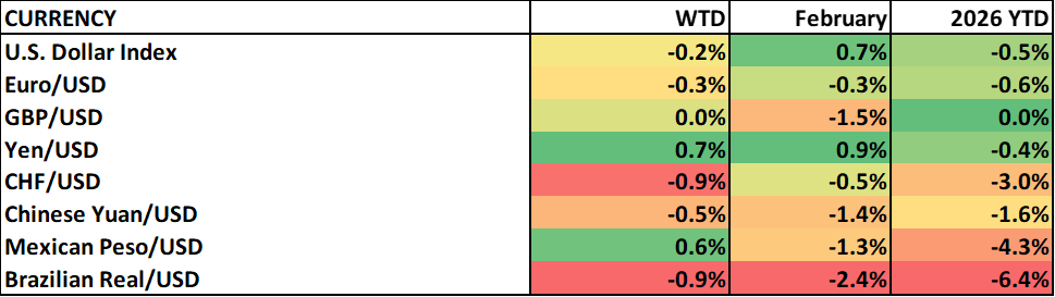 Treasuries continued to rally this week adding to gains for the month. Markets shrugged off today's inflation data and there seems to be a bit of a flight to safety amidst credit, geopolitical and labor market concerns. The USD index bottomed at the end of January and has moved modestly higher throughout the month.