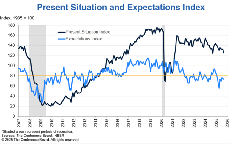 The other private data was the survey data. The Conference Board Consumer Confidence Index declined from last month, with Present Situations falling more than Expectations. According to the report, “The present situation component registered its largest drop in a year… their appraisal of current job availability fell for the ninth straight month to reach a new multiyear low…Consumers were a bit more pessimistic about future job availability and future business conditions but optimism about future income increased, mitigating the overall decline in the Expectations Index.”