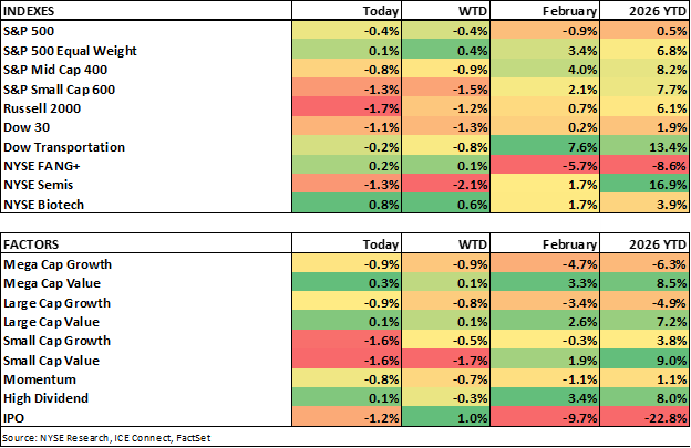 Four sectors weighed on the indexes. Software and mega caps brought down Comm Services and Tech. The NYSE FANG+ Index dropped 6% in February, with only Apple (modestly) and Netflix ending higher. High-flying memory names like Micron and Sandisk sold off over a few days in early February with overall weakness in Tech, recovered some but not all of that decline before declining to end the month.