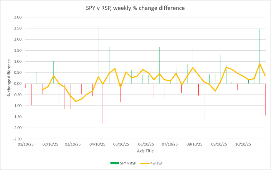 Some of the weakness was residual from the nothing-burgers that last week’s biggest events turned out to be, depriving markets of catalysts. Other than Halloween and a thrilling World Series Game 7, last week’s big event was President Trump and Chinese President Xi finally having their face-to-face meeting. The two essentially agreed to a one-year truce and ratified the agreements that were negotiated in the earlier part of the week. The Federal Reserve cut rates by 25bp and announced the end of its balance sheet run-off, but both were widely expected as well. Chair Powell, however, delivered Hawks a treat and Doves a trick when he said another rate cut in December was, “Not a foregone conclusion. Far from it.” The prospect of more rate cuts has been a tailwind for equities, especially the ones on the frothy/risky side. While the Fed is still likely to cut, it took some of the wind out of upside momentum as yields moved higher. While the S&P 500 gained almost 1%, the equal-weight version and small caps fell 1-2%, highlighting that those headline gains were only seen by a portion of the market- mostly large cap Tech. In fact, it was one of the largest outperformances by the market-weight versus the equal-weight this year. This week, that reversed.