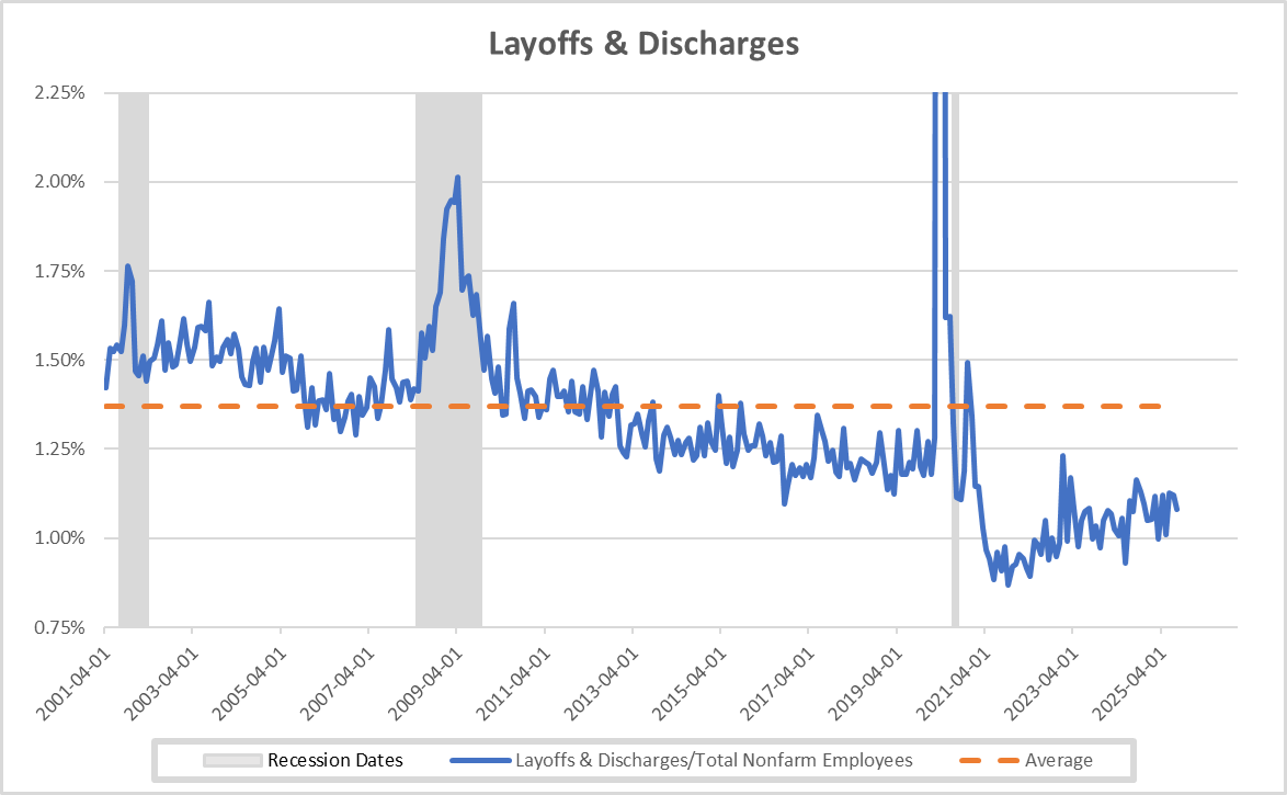 The last piece of government produced economic data before the shutdown was the JOLTS Job Openings which were essentially unchanged from last month at 7.2M. Both total hirings and separations ticked down slightly versus last month. Construction openings were markedly lower, falling 115k versus last month for the biggest openings decline. However, hirings increased 22K and quits snapped back towards June levels after falling sharply last month. The industry is getting a lot of attention in these updates as we look for signs of economic slowdown. Construction quits are expected to decrease when economic activity decreases as workers aren’t sure of getting new/better paying jobs. Accommodation and Food Services saw the largest increase in openings (+106k), as well as the largest decline in quits (-140k), though it also saw a 50k decline in hirings. Government hiring was unchanged while openings fell 37k and layoffs rose slightly. One metric that we pay close attention to is the layoffs and discharges as a percentage of total nonfarm payroll employees which is still at historically low levels, not suggesting that the labor market is deteriorating rapidly.
