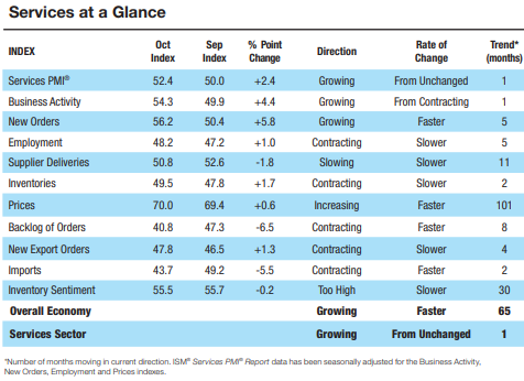 ISM Services painted a better picture coming in at 52.4, ahead of expectations, up from 50.8. The underlying metrics were solid with a big jump in new orders and business activity but there were big declines in imports and the backlog of orders. Employment remained in contraction for the 5th consecutive month but did tick up slightly. Prices increases also ticked higher. The comment section also had a much less gloomy tone as compared to the manufacturing sector.