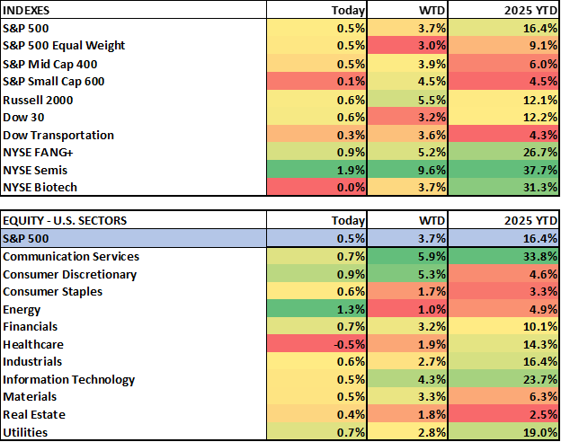 All sectors finished higher led by Comm Services (Meta and Alphabet +7-9%) and Discretionary (strength across the board). Staples and Energy lagged but still ended the week with gains.